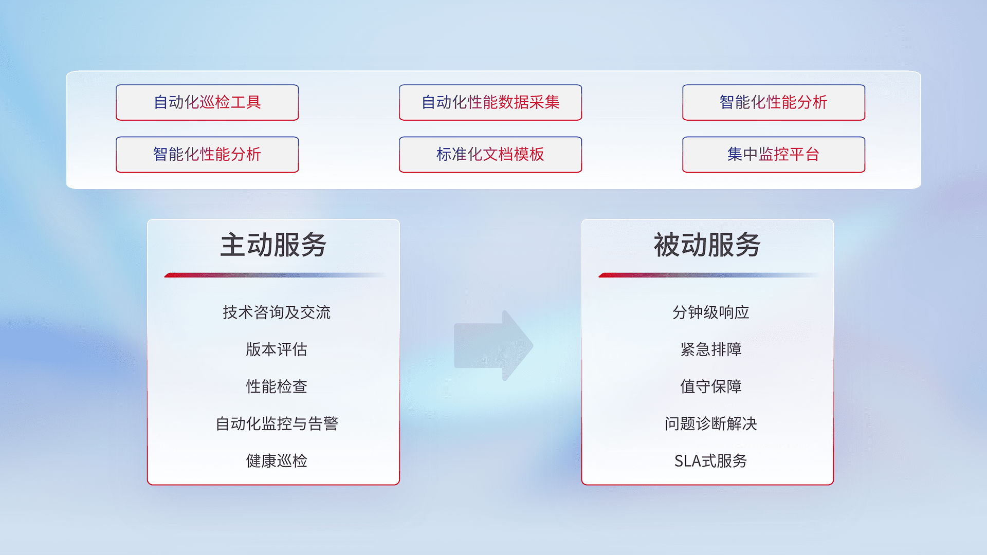 智能化工具和标准化文档,,保障服务质量,,提供主动服务(包含技术咨询、、版本评估、、性能检查、、、自动化监控与告警、、、、健康巡检)和被动服务包含(分钟级响应、、紧急排障、、、值守保障、、、问题诊断解决、、、、SLA服务)。。